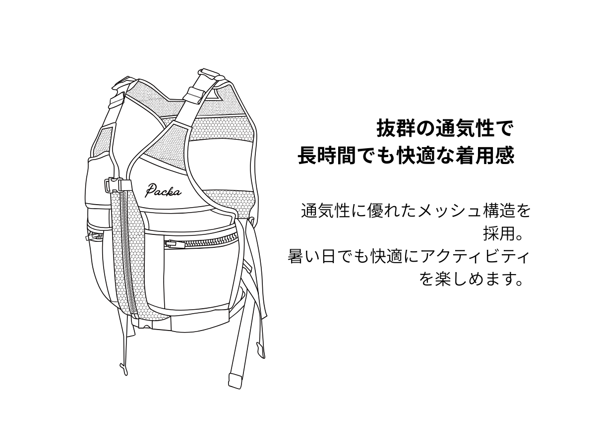 さらに、背面と本体のメッシュ構造により、暑い環境でも通気性がよく、快適な着用感を提供します。