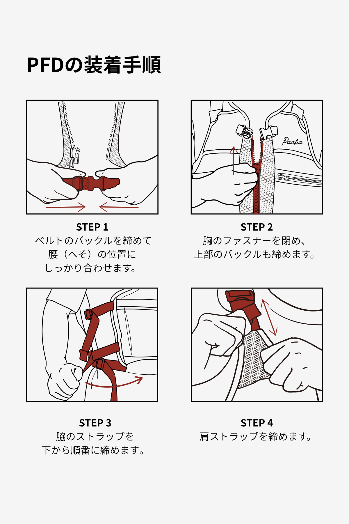 A2:PFDの下端がへその高さにくるように着用してください。